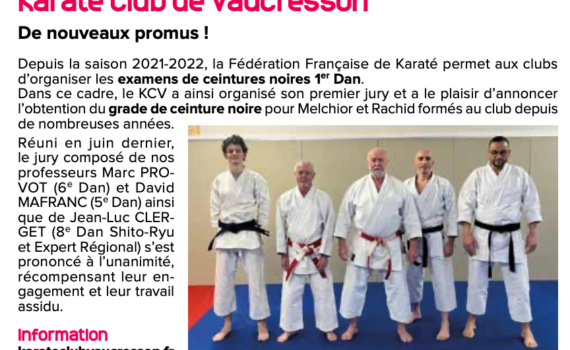 Le KCV est à l’honneur dans le journal de Vaucresson d’avril-mai, à l’occasion de l’obtention de la ceinture noire 1er Dan par Melchior et Rachid. Cliquer ici pour télécharger le journal