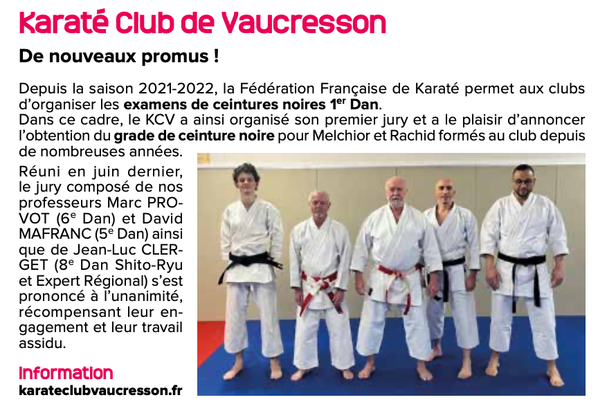 Le KCV est à l’honneur dans le journal de Vaucresson d’avril-mai, à l’occasion de l’obtention de la ceinture noire 1er Dan par Melchior et Rachid.